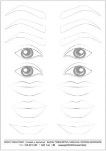 Można na niej pracować za pomocą piórek do microbladingu lub igłami maszynowymi. Format A5. Nadruk 3 pary brwi, 2 pary oczu, 3 pary ust.