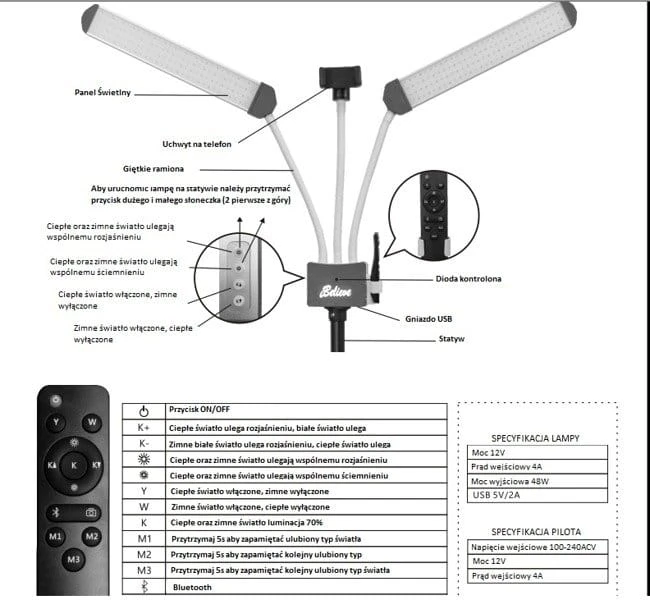 Do tego stabilny statyw, na którym znajduje się dioda kontrolna, wejście na USB oraz uchwyt na pilota, uchwyt na telefon. Z drugiej strony regulacja świateł.