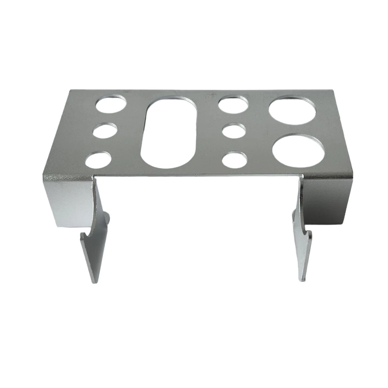 Prostokątna, aluminiowa podstawka na kubeczki do makijażu permanentnego i tatuażu. Posiada 9 otworów na kubeczki różnego rozmiaru.